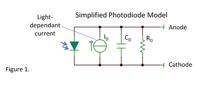 一个典型的光电二极管模型包含以下关键元素,一个二极管并联一个电流源,并且电流源与光强成正比。寄生元件CD和 RD会影响器件性能。