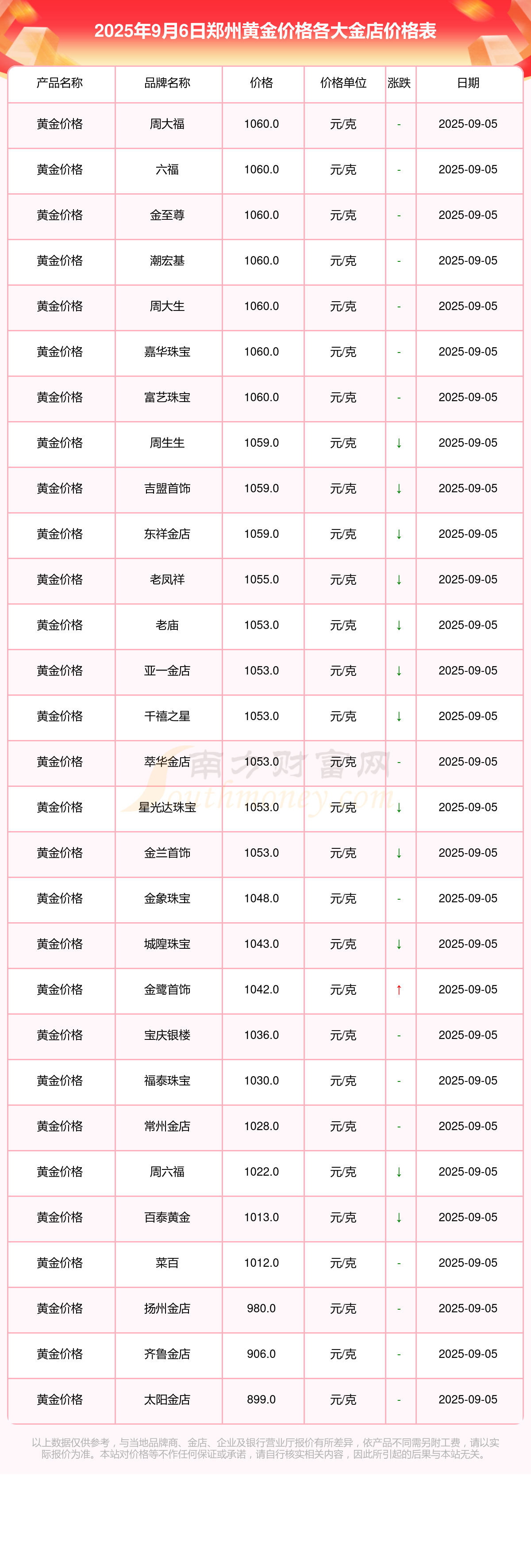 今天是2025年9月6日,郑州中国黄金、中国黄金、中国黄金、周大福、周大福、周大福、周大福、周大福、周大福、周大福、老凤祥等各大金店品牌黄金价格最新价格如下:中国黄金811.9元/克、中国黄金827.9元/克、中国黄金808.9元/克、周大福1060.0元/克、周大福558.0元/克、周大福1060.0元/克、周大福39460.0、周大福16000.0、周大福35620.0、周大福1050.0元/克、老凤祥1055.0元/克。