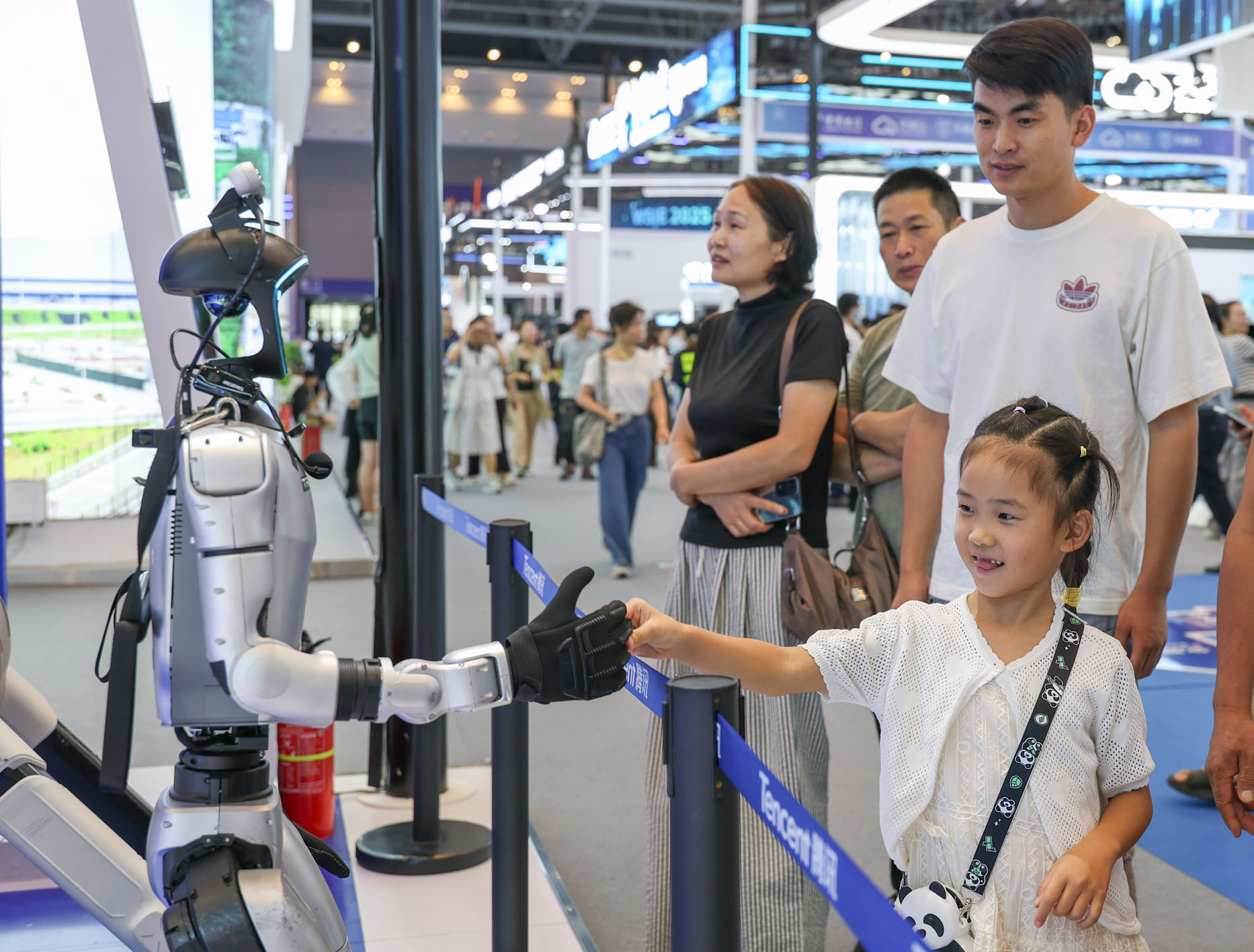 在腾讯展区,搭载Tairos(钛螺丝)开放平台的一台人形机器人正在与观众互动。它不仅能准确理解问题,还可结合环境信息做出实时反馈。现场技术人员邱燃表示,该平台相当于为机器人装上“大脑”,整合了多模态感知、任务规划等AI能力,支持双足、轮式、四足等多种机器人构型,目前已在家电、汽车等行业落地应用。